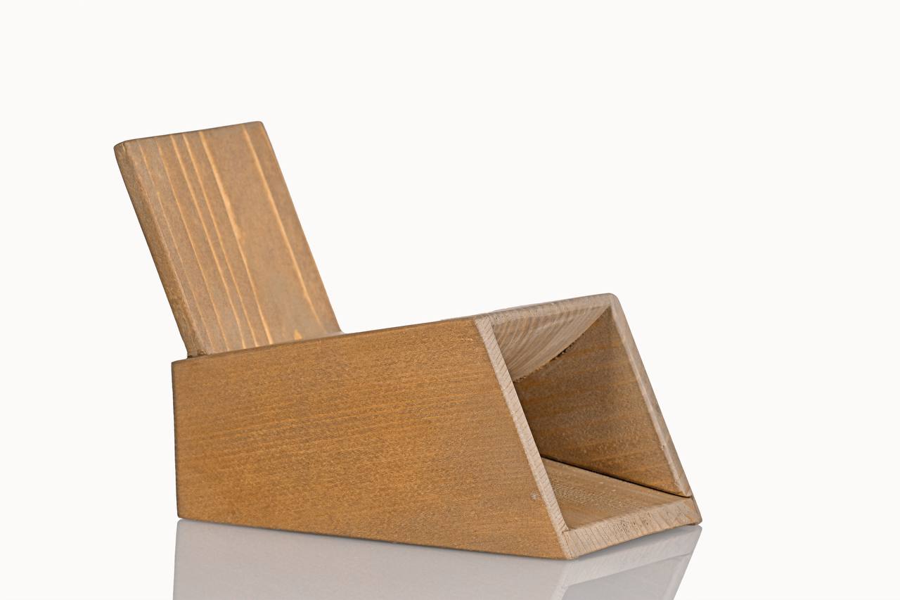 Parallelepipedo irregolare, con due facce uguali e le altre irregolari, in cui è inserito un elemento rettangolare (supporto): l’oggetto è di abete chiaro realizzato mediante lavorazione esclusivamente artigianale, progettato per amplificare passivamente il suono emesso da uno smartphone, con supporto per il dispositivo stesso. L’oggetto viene poi protetto con una vernice all’acqua effetto noce. Il design integra una fessura superiore o scanalatura per l’inserimento del dispositivo mobile e un condotto interno o cavità orientati per convogliare e diffondere il suono, in modo simile a una cassa armonica. Il prodotto è pensato sia per l’estetica (minimalismo, artigianalità) sia per la funzionalità, senza l’uso di componenti elettronici